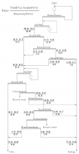 El concentrador de hierro de Dahongshan se utilizó para adaptar el proceso tecnológico de cuatro etapas compuesto de molienda, magnetismo débil, separación magnética fuerte y flotación inversa. En vista de las características de los minerales crudos, el resultado de la flotación inversa no fue satisfactorio. Por lo tanto, reemplazaron la flotación inversa con mesas vibratorias hace unos años. Sin embargo, el agitador tiene las desventajas de una pequeña capacidad de manejo y una baja tasa de recuperación de concentrados de hierro. En 2010, llevaron a cabo una cooperación con SLon. Aprendimos de los problemas que surgieron y determinamos un esquema de combinación óptimo. Después de varios experimentos, resultó bien. Entonces compraron 72 separadores centrífugos SLon-2400 y pusieron en práctica el esquema de combinación magnética y gravitacional (separador magnético húmedo de alta intensidad + separador centrífugo). El diagrama de flujo detallado se muestra en la figura. El proyecto se ha estado ejecutando con éxito durante casi 10 años desde 2010. En el caso de minerales crudos con una ley de 35,61%, la ley del concentrado de hierro en todo el proceso se ha incrementado del 62-63% al 64-65% y la tasa de recuperación llegó hasta el 72,68%.
