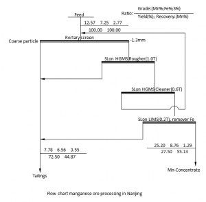 Si el grado de los concentrados de manganeso es superior al 22%, se puede utilizar como materia prima para producir sulfato de manganeso. Por lo tanto, para aprovechar al máximo los recursos de manganeso, el Instituto de Investigación de Minas de Maanshan tomó la iniciativa e introdujo el Separador Magnético Húmedo de Alta Intensidad SLon-1500 (WHIMS) y el Separador Magnético de Tambor Húmedo SLon en el proceso técnico para la recuperación de relaves en 2005. El proyecto se puso en funcionamiento con éxito en noviembre de ese año. El esquema detallado se muestra a continuación. Del gráfico, sabemos que en el caso de las materias primas con 12,57% de Mn, el grado (25,2%), el rendimiento (27,5%) y la tasa de recuperación (55,13%) de los concentrados de manganeso logran el efecto deseado, lo que crea enormes beneficios económicos. El medio ambiente que nos rodea está mejorando cada vez más.